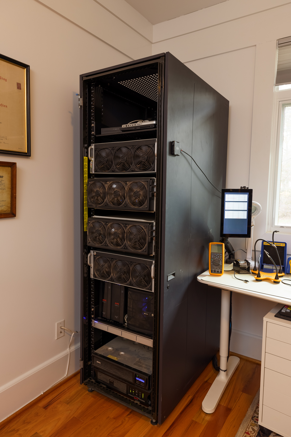 The server is running on FreeNAS 12.0 with 6x 8-drive RAID-Z2 virtual devices (vdevs) with 8TB disks for a total of ~250 TB of usable, redundant space. These drives in the main chassis (or "head unit") are connected to an LSI 9305-24i. The drives in the second chassis (or "expansion shelf") are connected with an LSI 9305-16e and a SAS3 expander backplane. The boot volume is stored on 2x mirrored Intel 540s 120 GB SSDs. I have an internally-mouted pair of 2 TB SATA SSDs striped together for ~4TB of fast, temporary data storage. The head unit is housed in a SuperMicro SC846 chassis with two 920W redundant PSUs; the expansion has the same. The system is built on a SuperMicro X10SRL-F LGA2011-v3 motherboard. I’m using an Intel Xeon E5-2666 v3 (10C/20T @ 2.9GHz) and 8 modules of 16GB DDR4 Samsung ECC/registered memory for a total of 128GB of RAM. I’m using a Noctua cooler on the CPU and I replaced the noisy stock chassis fans with quieter Noctua fans. I also created a front fan shroud that holds 3x 140mm fans to increase cooling while keeping noise levels down. I have one mounted on both the head unit and the expansion shelf. I have two APC 1500VA Smart-UPSs and have them and the file server in a 42U Dell rack cabinet from Craigslist.