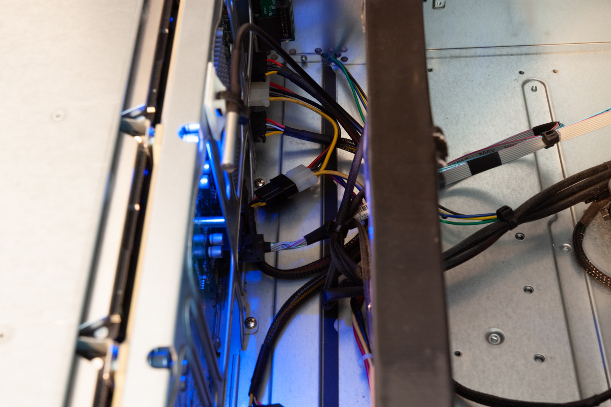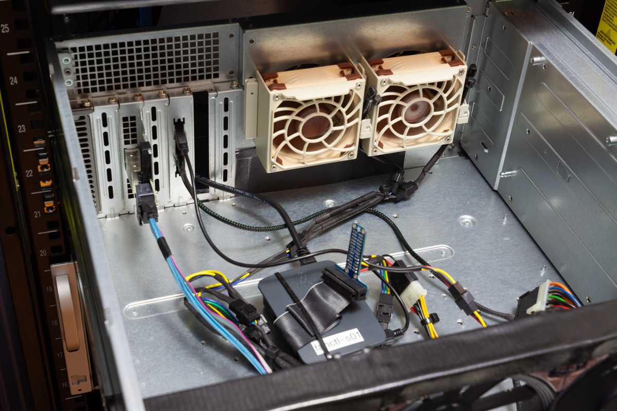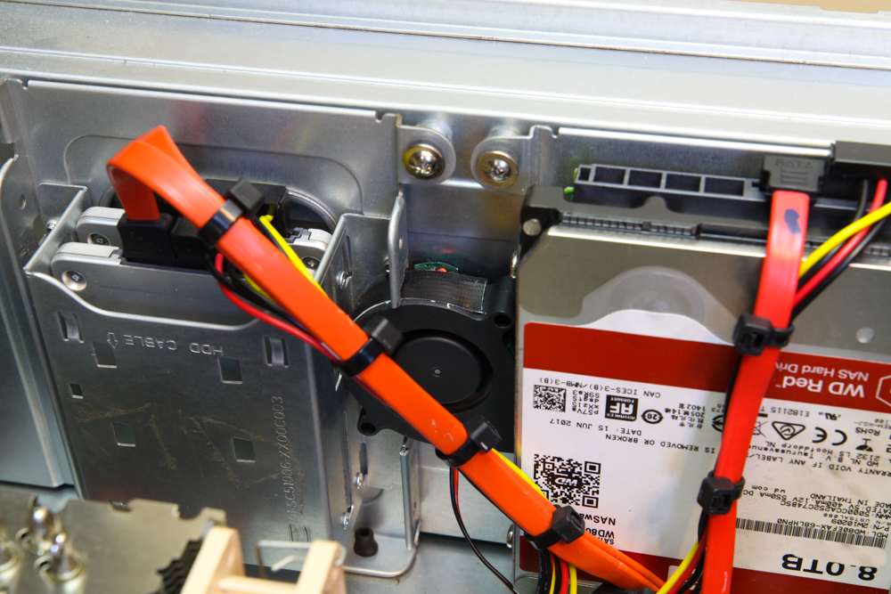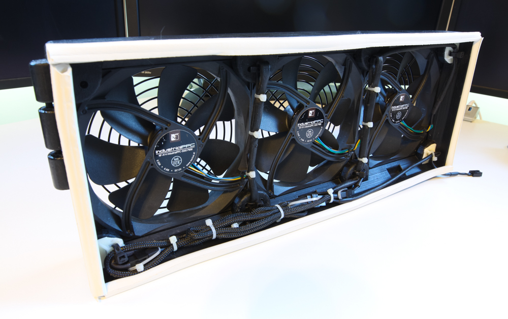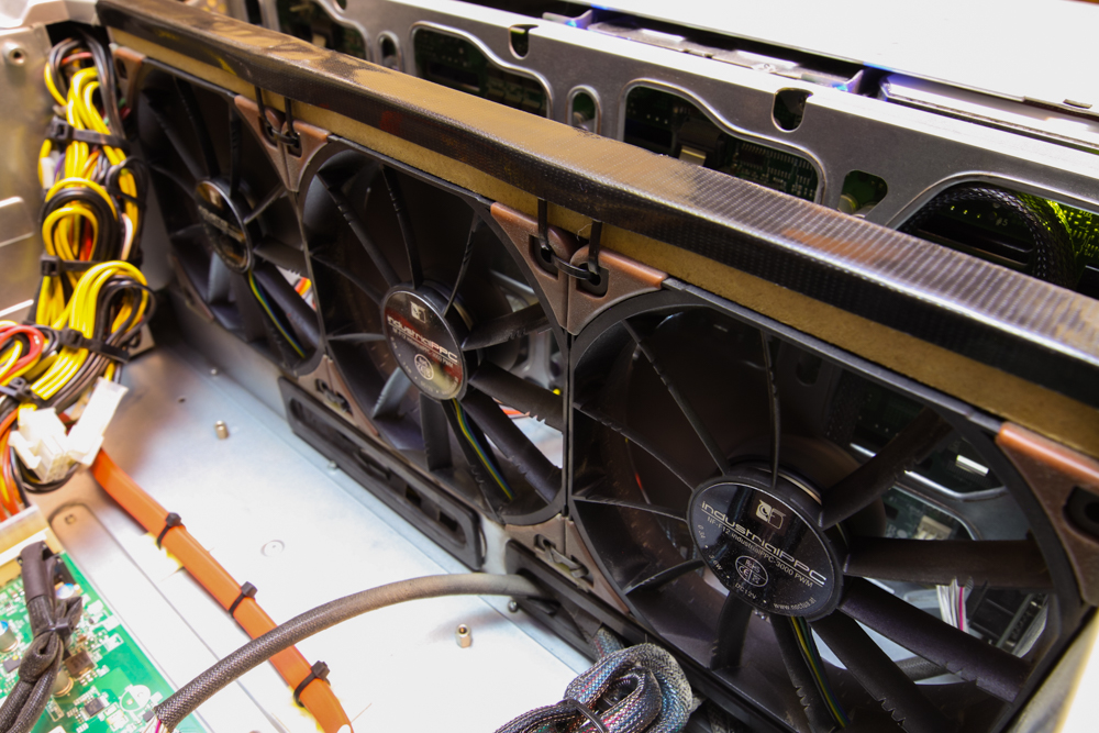 A view of the fan wall, secured with zip ties. The strip on top of the fan wall helps to seal off the two sections of the chassis, making sure air flows through the drive bays rather than back over top of the fan wall.
