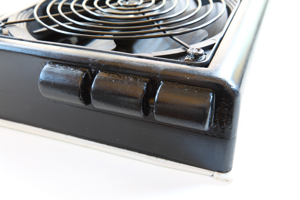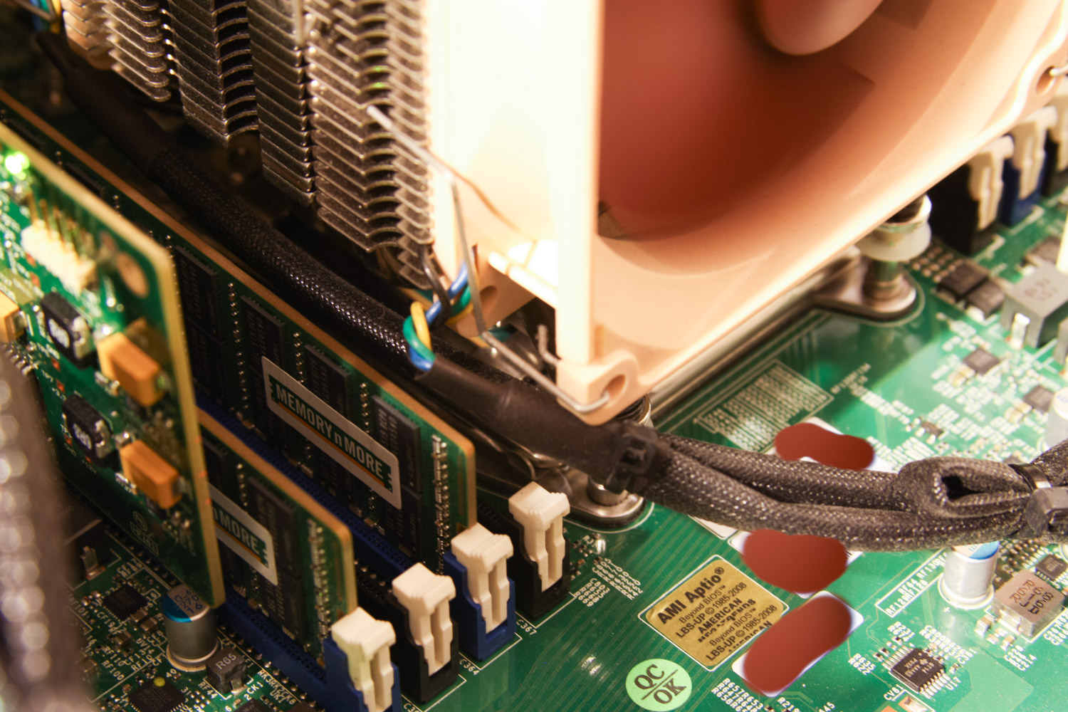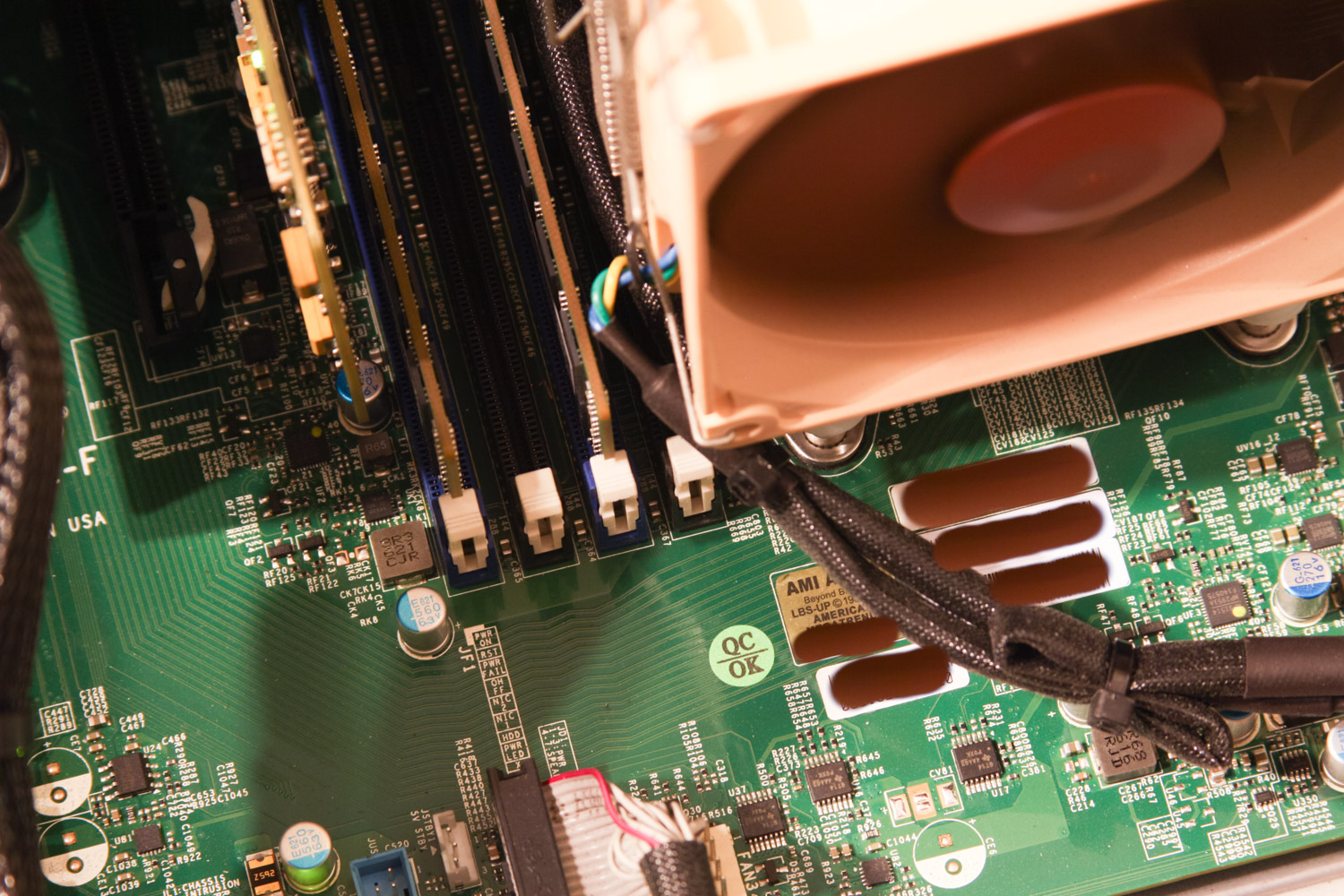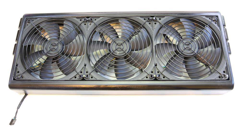 A view of the fan wall, secured with zip ties. The strip on top of the fan wall helps to seal off the two sections of the chassis, making sure air flows through the drive bays rather than back over top of the fan wall.