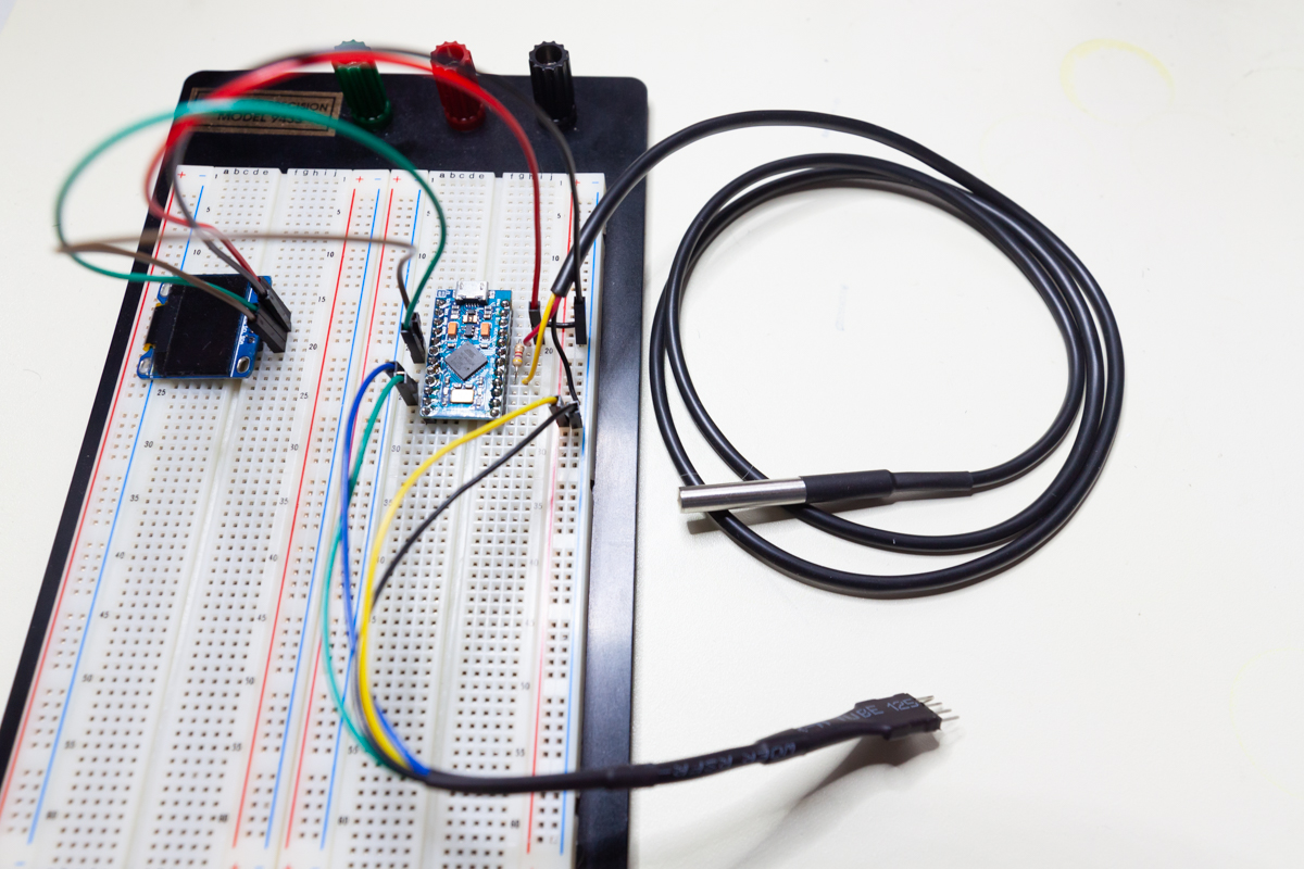 The photo below shows the test setup on a breadboard with the I2C display on the left, the thermal probe on the right, and the fan connection on the bottom.