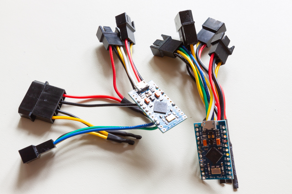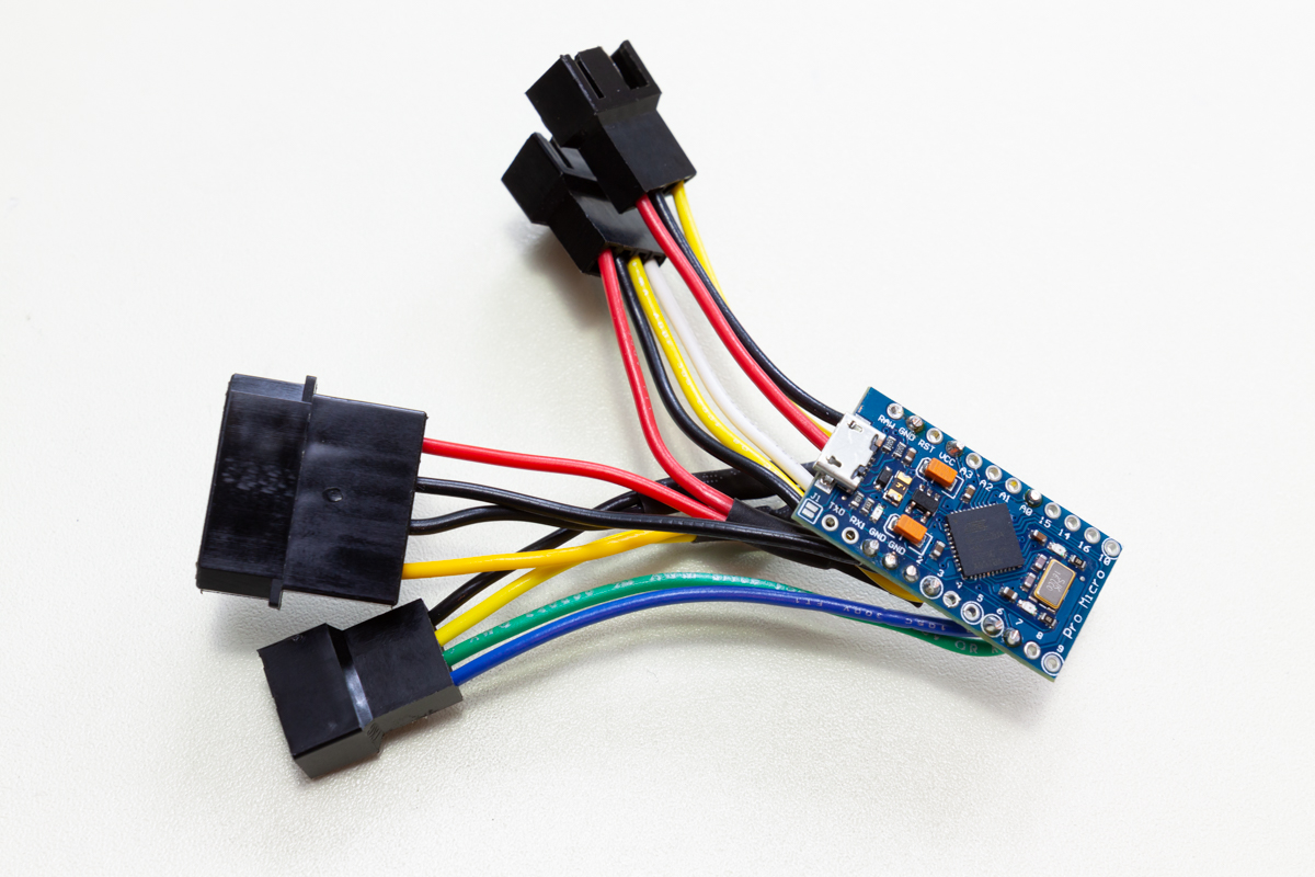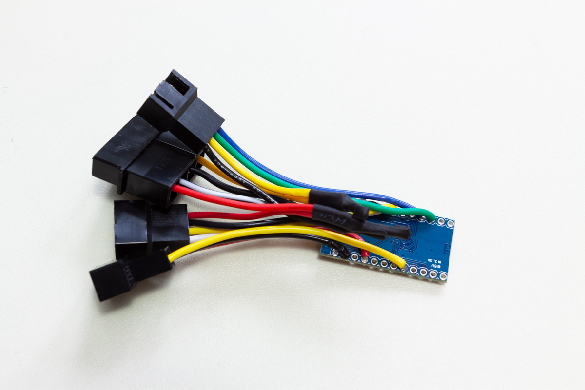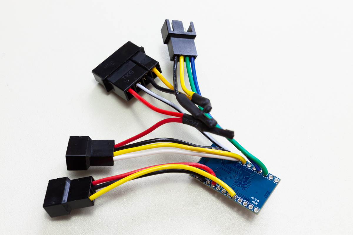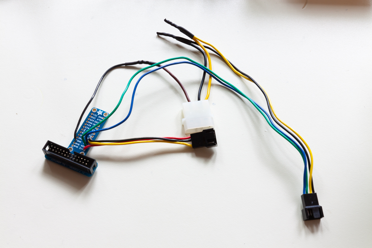 This is the wiring harness I created for the Arduinos. It has (from left to right) a connection for all the fans, a MOLEX 4-pin connection for PSU power, a connection for the I2C displays, and a connection for the thermal probe. The display and thermal probe attach via the same 4-pin connectors that the PWM fans use (I ordered all the pins and connectors and stuff in bulk...)