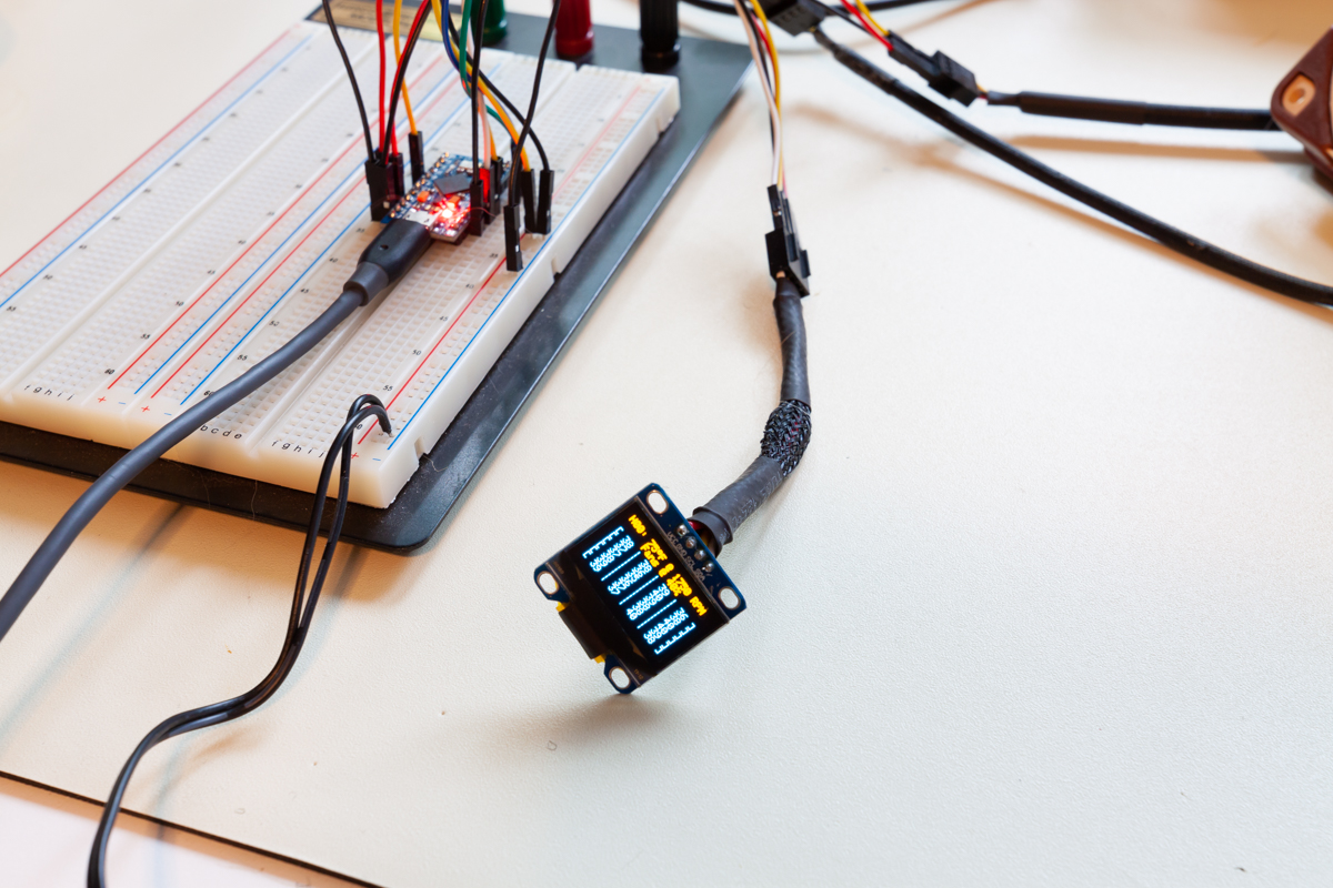 The photos below show the I2C display I used, first in testing, then in its 3D printed mount that was secured with Velcro to the top of each chassis.