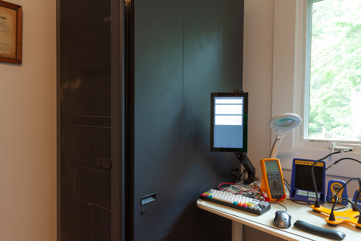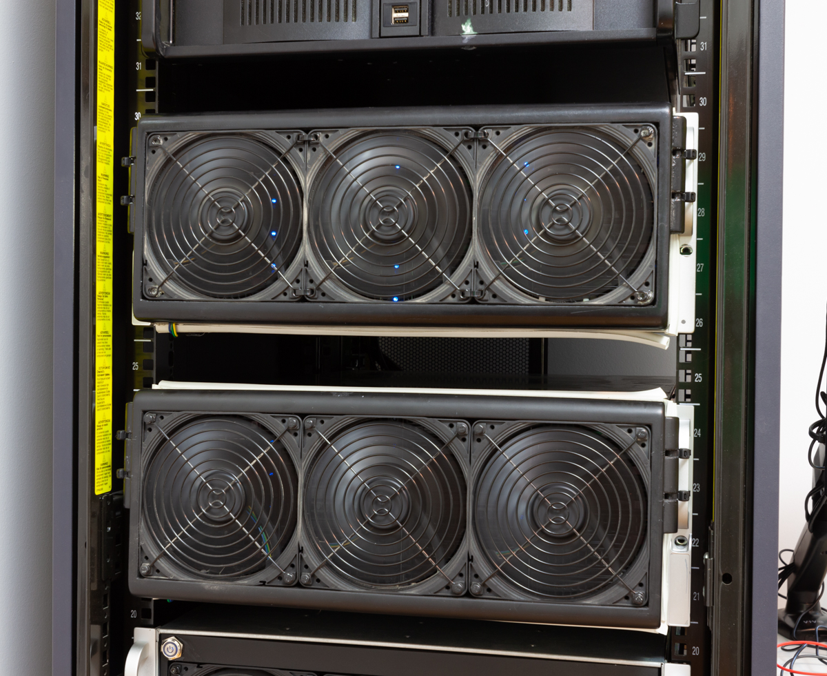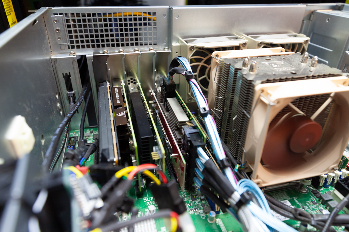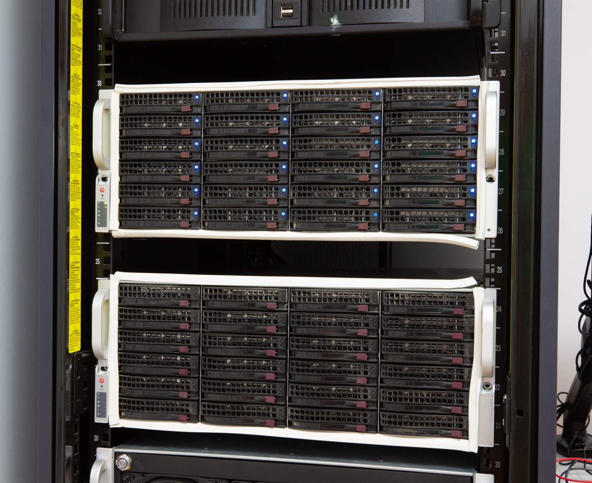 The server is running on FreeNAS 12.0 with 6x 8-drive RAID-Z2 virtual devices (vdevs) with 8TB disks for a total of ~250 TB of usable, redundant space. These drives in the main chassis (or "head unit") are connected to an LSI 9305-24i. The drives in the second chassis (or "expansion shelf") are connected with an LSI 9305-16e and a SAS3 expander backplane. The boot volume is stored on 2x mirrored Intel 540s 120 GB SSDs. I have an internally-mouted pair of 2 TB SATA SSDs striped together for ~4TB of fast, temporary data storage. The head unit is housed in a SuperMicro SC846 chassis with two 920W redundant PSUs; the expansion has the same. The system is built on a SuperMicro X10SRL-F LGA2011-v3 motherboard. I’m using an Intel Xeon E5-2666 v3 (10C/20T @ 2.9GHz) and 8 modules of 16GB DDR4 Samsung ECC/registered memory for a total of 128GB of RAM. I’m using a Noctua cooler on the CPU and I replaced the noisy stock chassis fans with quieter Noctua fans. I also created a front fan shroud that holds 3x 140mm fans to increase cooling while keeping noise levels down. I have one mounted on both the head unit and the expansion shelf. I have two APC 1500VA Smart-UPSs and have them and the file server in a 42U Dell rack cabinet from Craigslist.