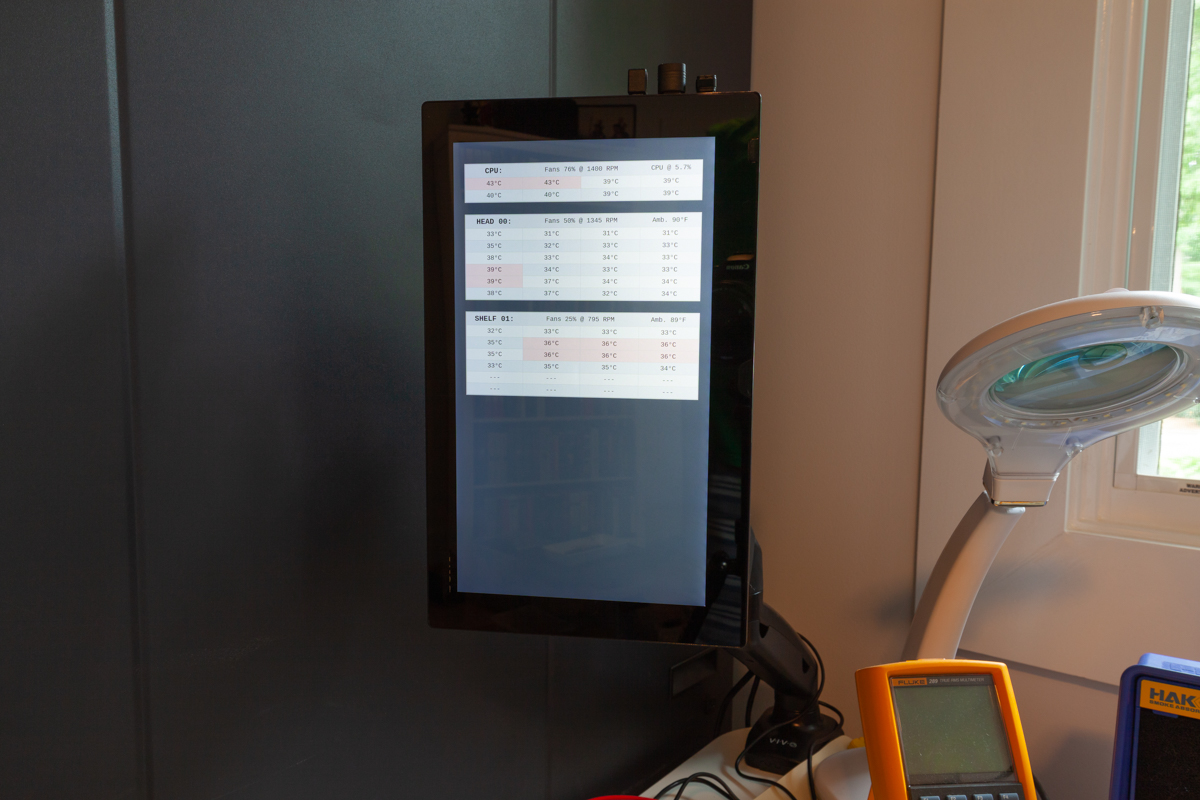 The dedicated 11" display for system stats, including drive temperatures, ambient chassis temp, CPU temp and load, and fan speeds.