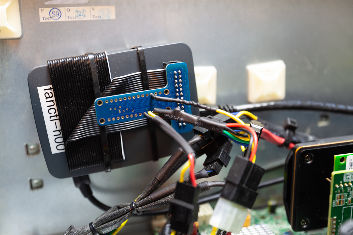 The Pi's wiring has a connection for the fans (top left), a 4-pin MOLEX for extra power (lower left), and for the thermal probe (center).
