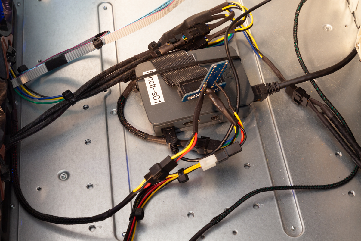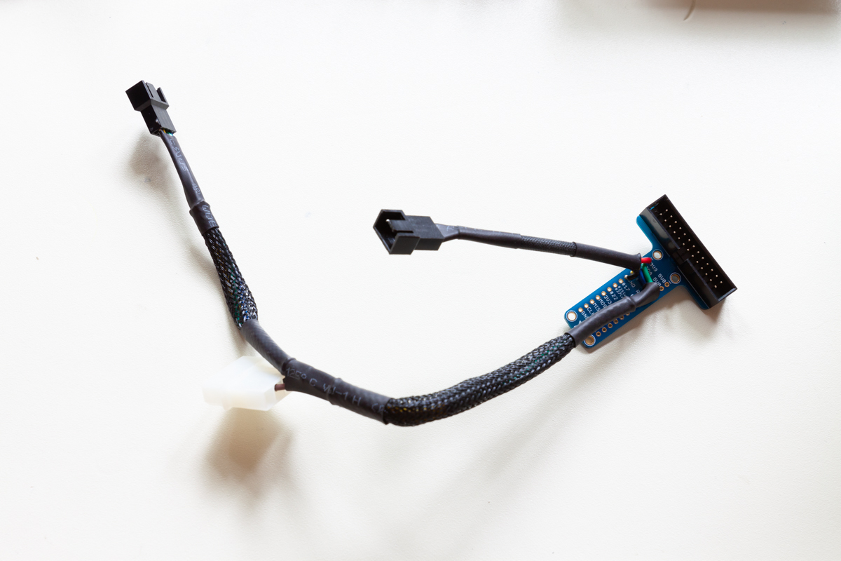 The final problem, independent fan control for each chassis, proved to be the most difficult to solve. Totally independent cooling "zones" required a major overhaul of the software fan control setup I went through above. The major issue I faced was that my motherboard does support two fan zones but I was already using both of them: one for the CPU and one for the disks. If I just ran a long PWM fan cable from the main chassis to the shelf, the fans in the shelf would have to run at the same speed as those in the head unit and that obviously isn't ideal. I naturally wanted to be able to control the fans in each chassis based on the drive temperatures in that chassis.