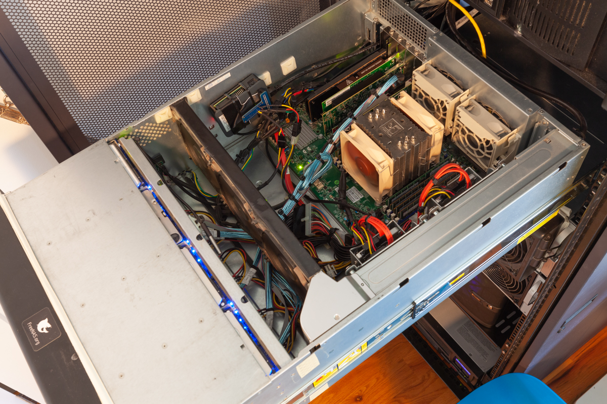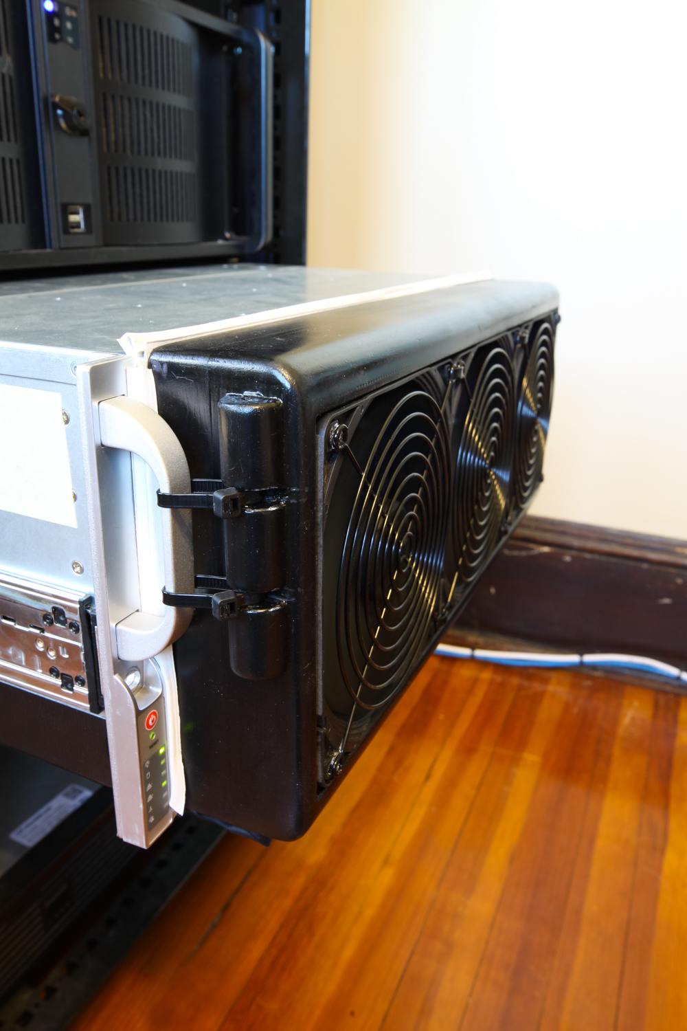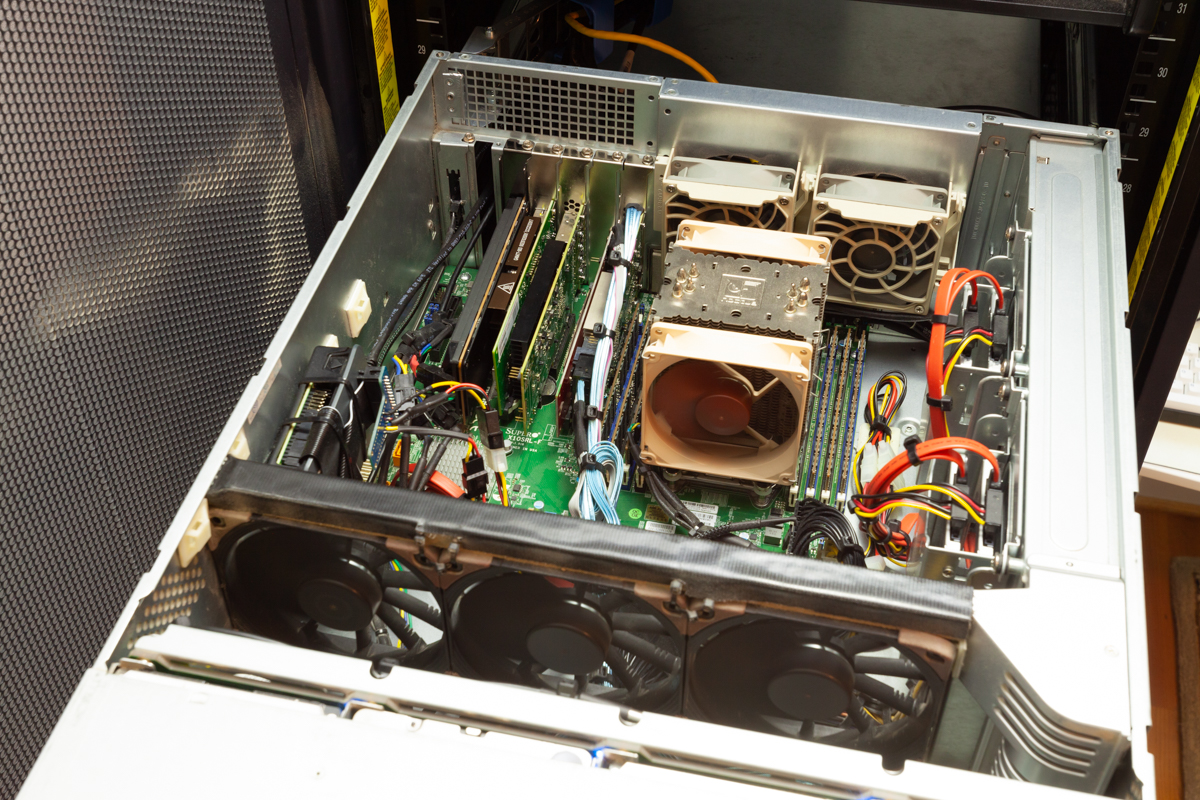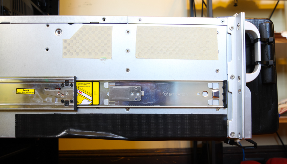 The front of the server with the front fan shroud removed (note the weather stripping tape around the edges).