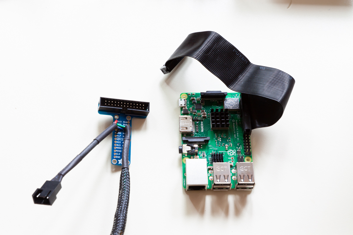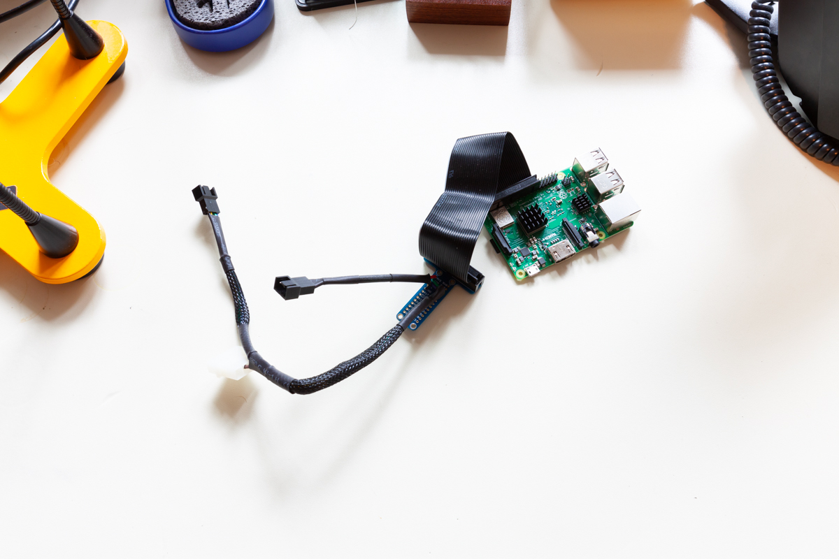 The bare Raspberry Pi and wire harness are picked below (attached via a ribbon cable). Since I'm using a separate unit to display system statistics, I didn't need a plug for the display on the Pi.