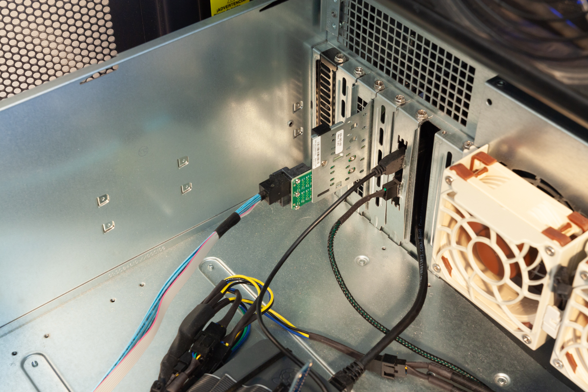 Dual PSU setups are typically used for extreme overclocking and multi-gpu systems like crypto mining rigs, in which case the PSUs are sitting right next to each other, so the wires running between the two PSUs are pretty short. In my case, I needed about 6 to 8 feet (or about 2 meters) of cable length to run the connection between the two chassis. To accomplish this, I cut off the secondary ATX connector, crimped on a standard female fan connector, made a long cable with male fan connectors on either end, and connected that cable between the two chassis. I basically just spliced in an extra 2 meters of wire on each connection, but made the cable detachable for easier system management. Thankfully, this solution ended up working perfectly. Pressing the power button powers up both pairs of PSUs simultaneously; starting the system via IPMI works too. The shelf also powers down as expected. I was expecting some weird quirk to pop up in an edge case, but nope, it just worked. If I ever add more expansion shelves, I’ll just need to tap those two wires and connect them to the new chassis. I'm not sure at what point the voltage on the PS_ON line will degrade enough that the remote PSU won't flip on, but when and if that happens, I'll come up with another solution.