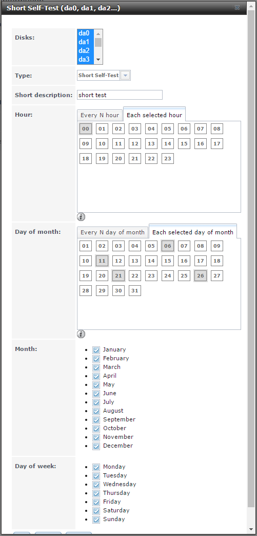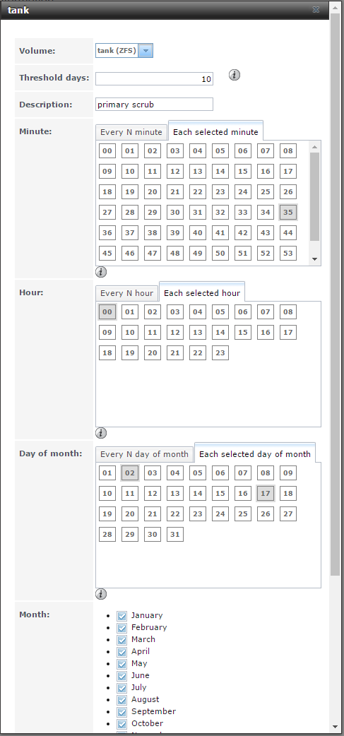 I set my primary dataset with recordsize = 1MiB to account for data block placement in an 8-drive Z2 array. Most of the data is shared via SMB/CIFS. I also have an iSCSI share on the main pool mounted on my desktop for my Steam library, and an iSCSI share on the mirrored SATA SSDs mounted in one of the VMs (and then reshared via SMB). The system hosts several different Debian-based bhyve VMs to run various services I use on a day-to-day basis (including nginx, pi-hole, irssi, an OpenVPN server, and an rclone client I use to back up my data to ~~the cloud~~). I have scripts set up to send SMART and zpool status reports to my email address on a weekly basis and scrubs/SMART checks scheduled every 2 weeks. I also have a script that automatically adjust the chassis fan speeds based on live HDD and CPU temps.